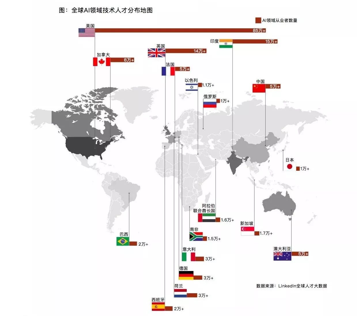 美国以近46%的比例高居全球人工智能领域人才榜首,分布数量是中国的14倍,接近垄断的位置。而且在领英3600万的用户数据库中,统计到的中国AI技术人才,不一定全部分布在中国,所以人才拥有数量上中美之间仍存在一定的差距。